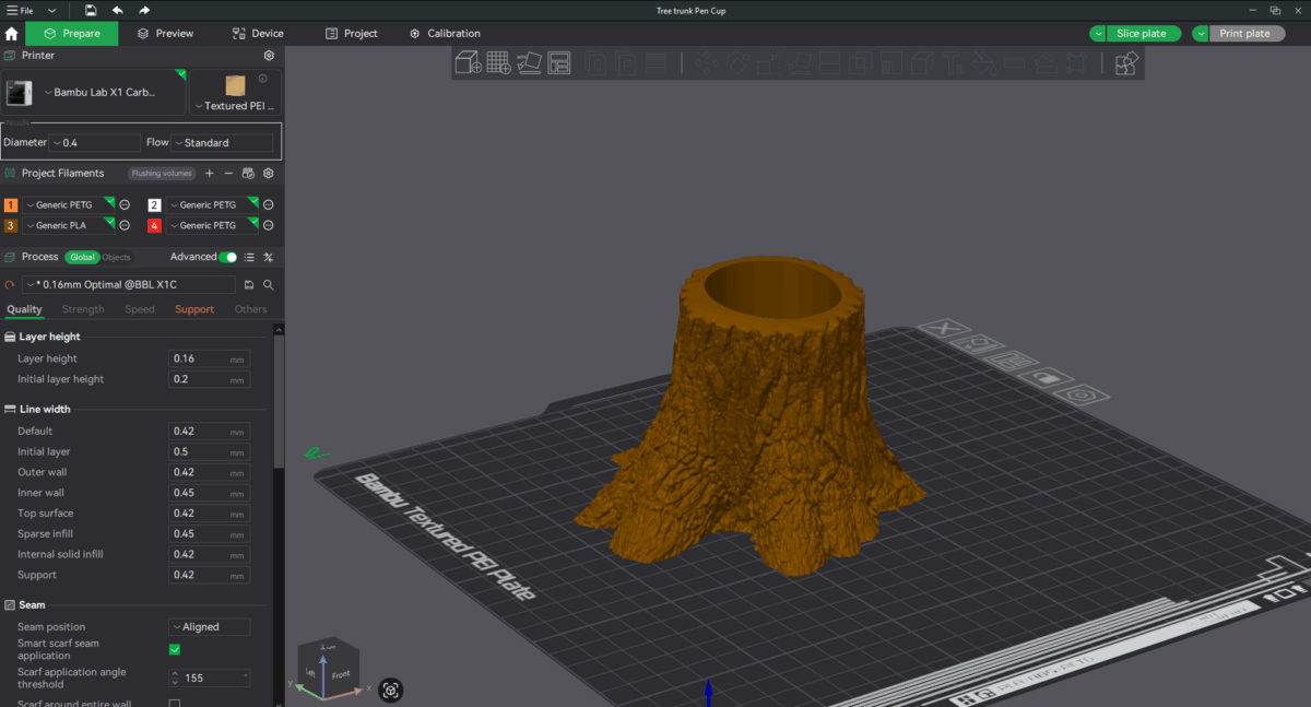 I brought the tree mesh into Bambu Studio first to quickly add a simple cylinder cutout for pens. It worked great, but I also wanted to demonstrate how to do it with more control in Fusion 360, so I created a second version with a customized recess.